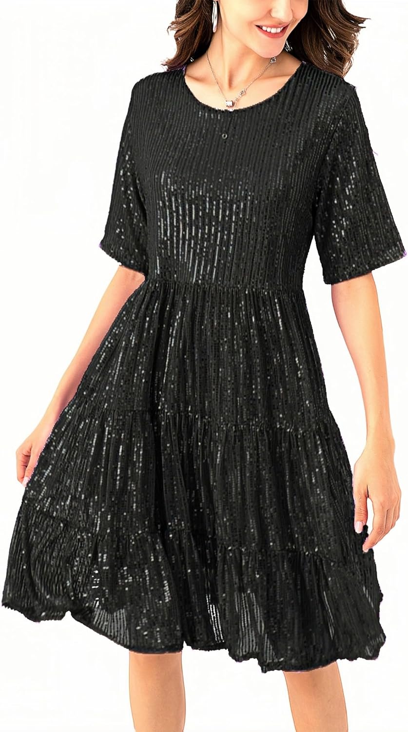 Fancy Uyee Women's Summer Sequin Babydoll Dress Short Flowy Tiered Tunic Sparkle Glitter Dresses Party Club