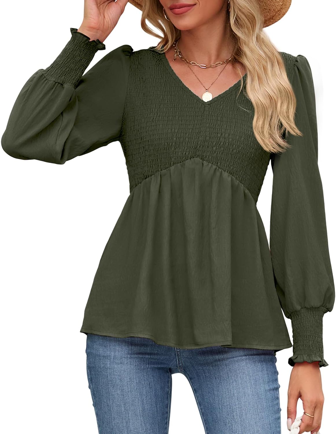 HEYTALALA Womens Long Sleeve Shirts V Neck Peplum Tops Dressy Casual Smocked Babydoll Blouses 2025 Fall Trendy Outfits