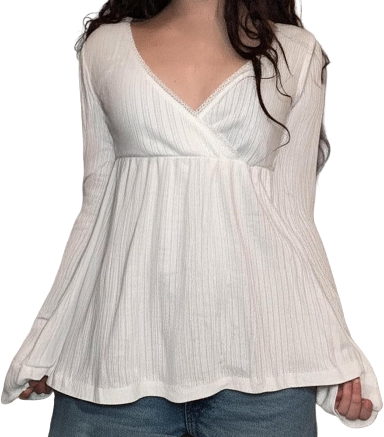 Women Y2k Vintage Long Sleeve Tops Babydoll Peplum Lace Trim Shirt Aesthetic Fairy Grunge Tunic Top Streewear