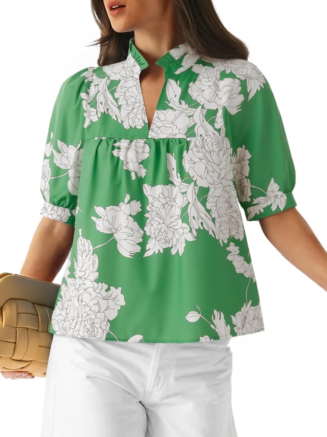 Cicy Bell Womens Floral Babydoll Blouse Peplum Puff Sleeve V Neck Tops Casual Pleated Loose Fit Boho Shirts
