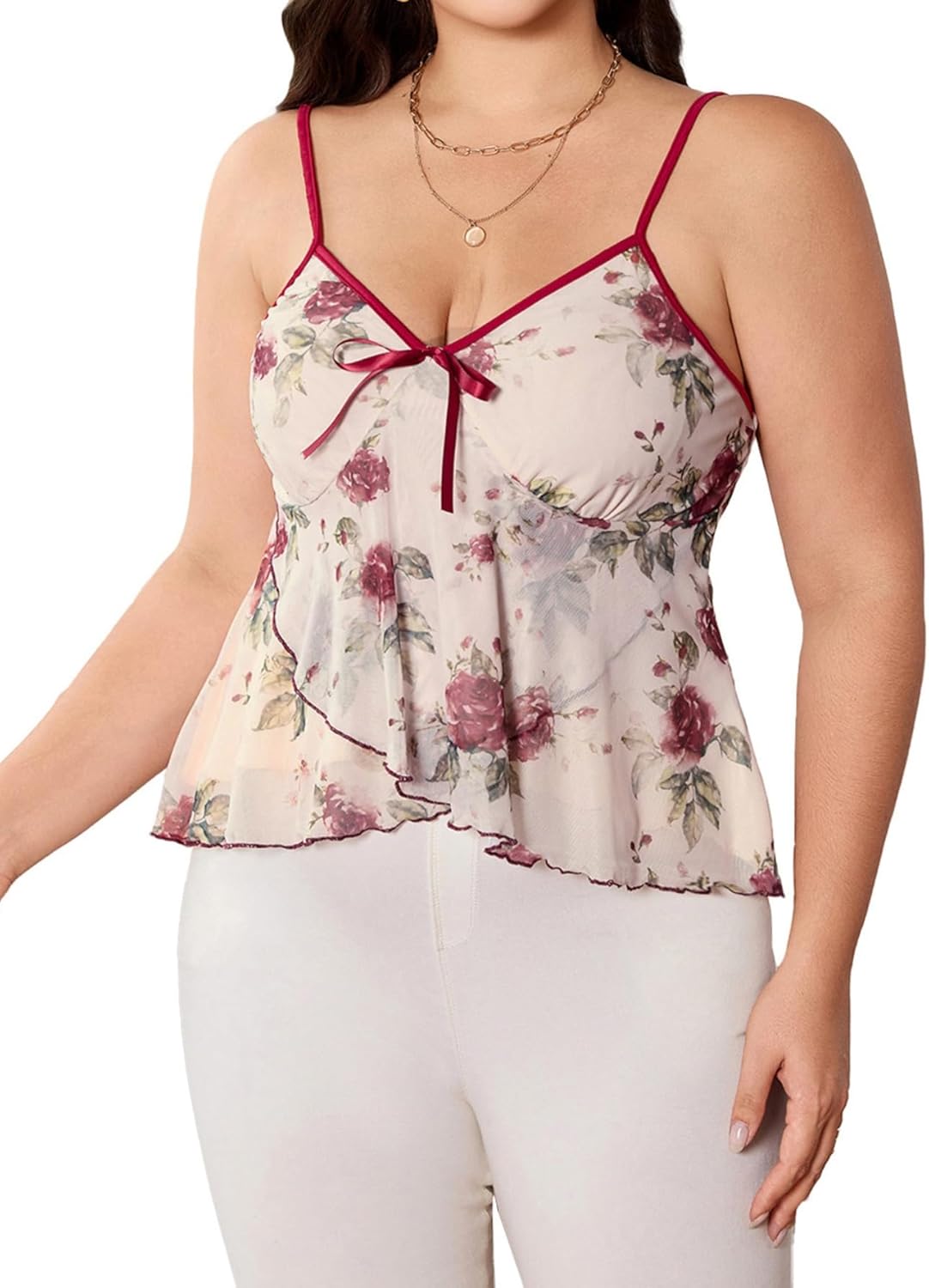 Verdusa Women's Plus Size Floral Bow Tie Ruffle Cami Top V Neck Sleeveless Peplum Top