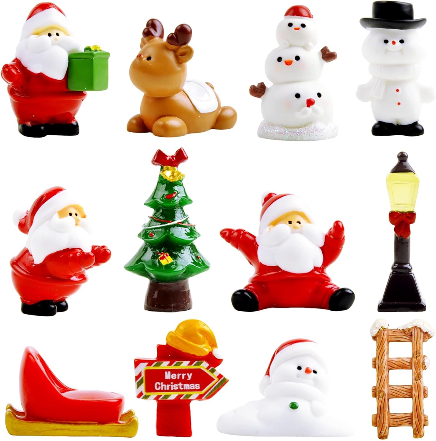 - 12-Piece Festive Miniature Set: This Christmas figurine set includes 12 unique holiday-themed designs—featuring Santa Claus, snowmen, reindeer, sleigh, street lamp, Christmas tree, and festive signs. Each piece adds a delightful seasonal touch to miniature displays, dioramas, and Christmas crafts