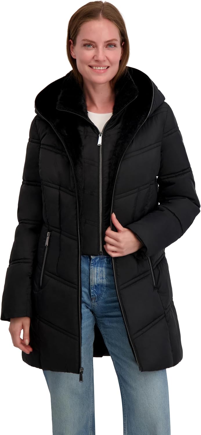 Laundry by Shelli Segal womens Quilted Puffer Flare Jacket– Winter Coat With Faux Fur Bib Collar & Hood