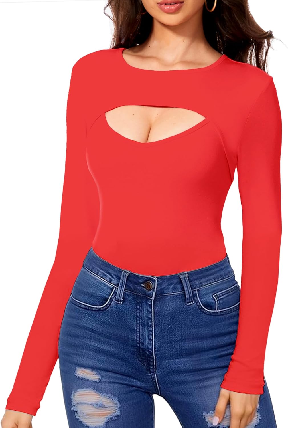 Womens Long Sleeve Tops Cut Out Front Ribbed Fitted Sexy Cute Casual Tops Tee Dressy T-Shirts Tshirt