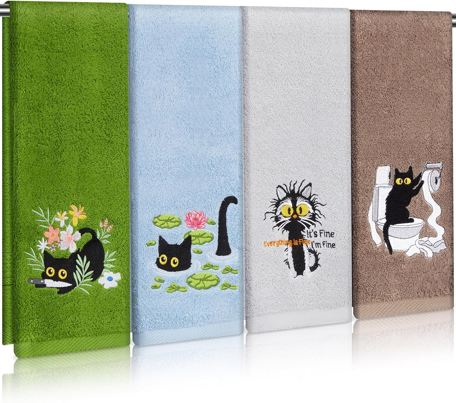 4 Pack Funny Black Cat Hand Towels Embroidered Towels Set for Bathroom Kitchen Decor Soft Absorbent Cotton Face Wash Cat Lover Gifts for Women Men Home Accessories 29" x 13"