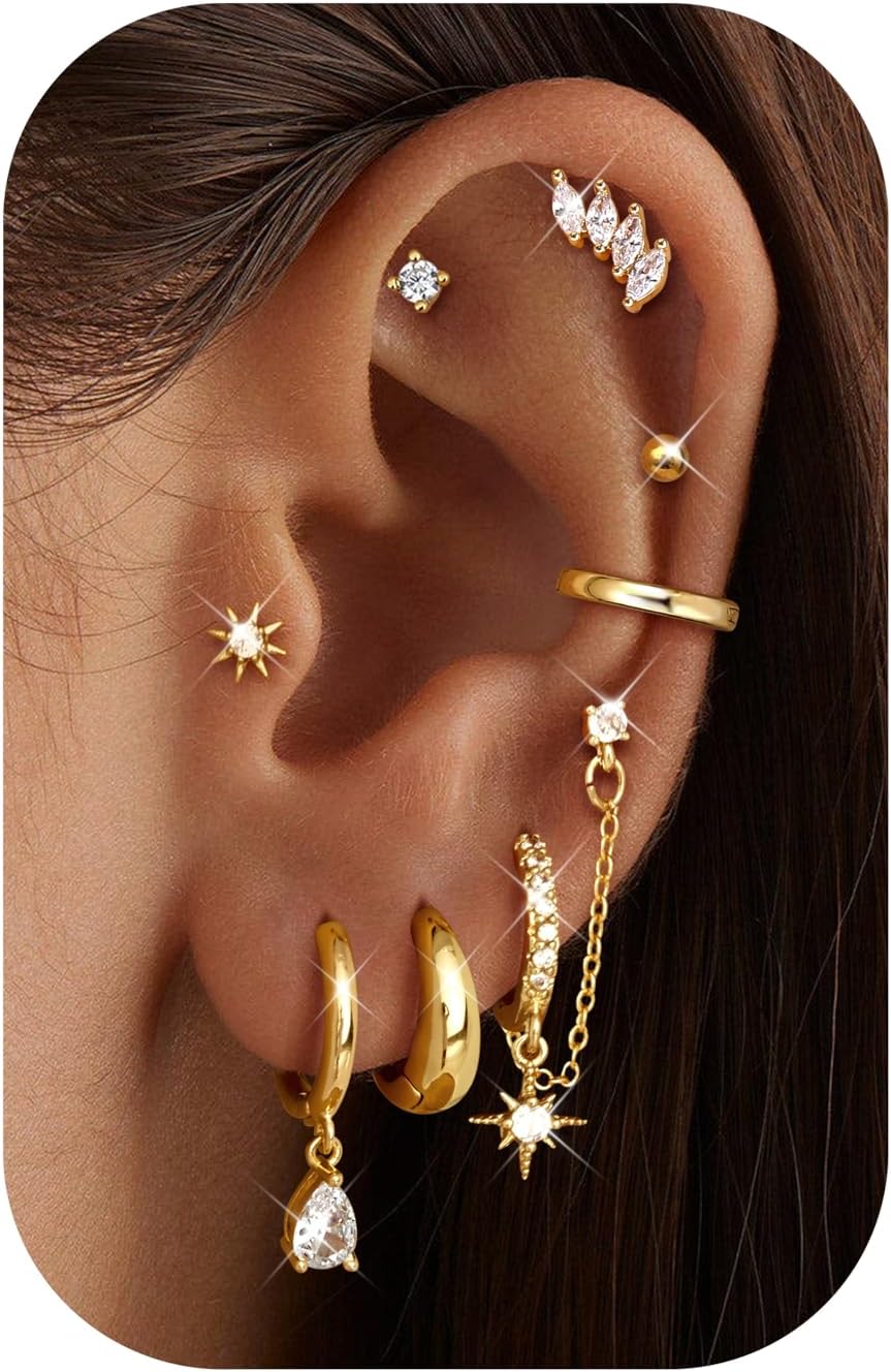 LOLIAS Hypoallergenic 14K Gold Plated Hoop Stud Earring Stacks for Women Trendy - Chain Cartilage Earrings Cute Silver Huggie Earrings Sets for Multiple Piercing Jewelry Lightweight 8Pairs