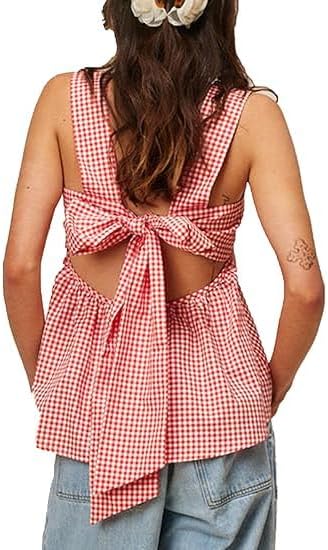 Gingham Peplum Tank Top for Women Y2K Sleeveless Square Neck Babydoll Tops Bow Tie Back Vest Shirt Summer