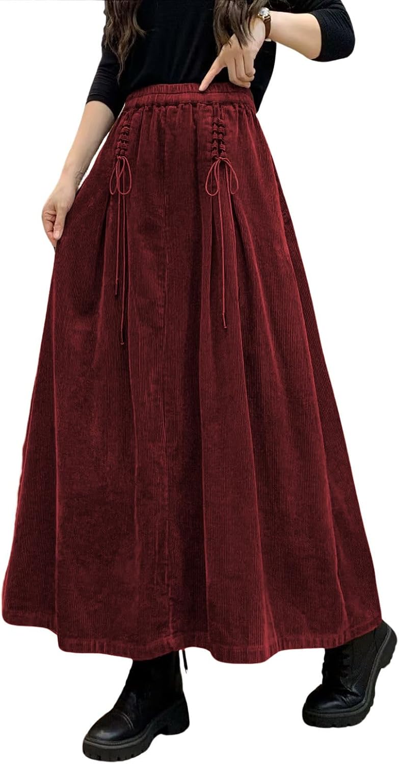 ebossy Women's Corduroy Maxi Skirt Elastic High Waist Drawstring Tie Front A-Line Pleated Long Skirt with Pockets
