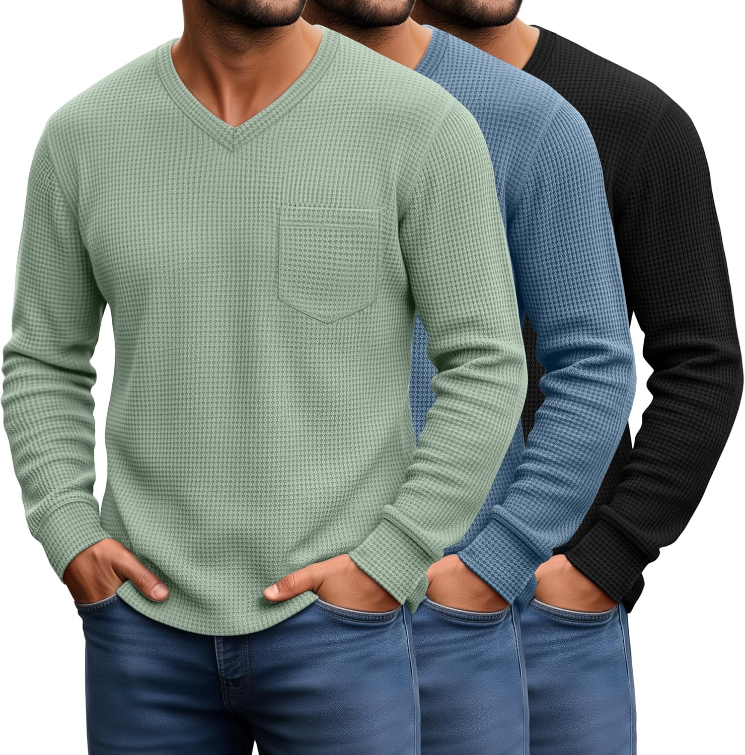 3 Pack Men's Waffle Thermal Long Sleeve Shirts V Neck Lightweight Tops Casual Pullover Undershirts with Pocket