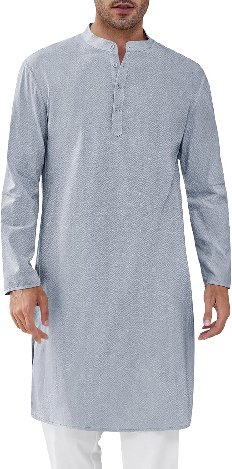 Runcati Mens Kaftan Thobe Textured Henley Shirt Long Sleeve Robe Casual Muslim Gown Shirt