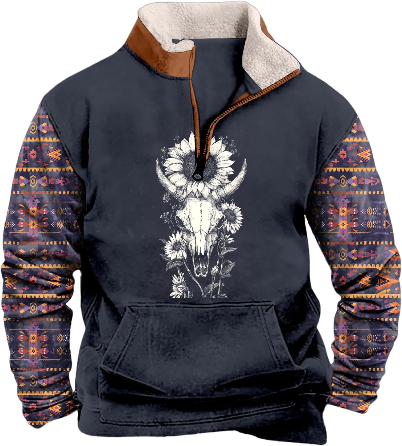 Mens Aztec Cowboy Sweatshirt Western Retro Vintage Ethnic Geometric Fall Long Sleeve Shirts with Pockets