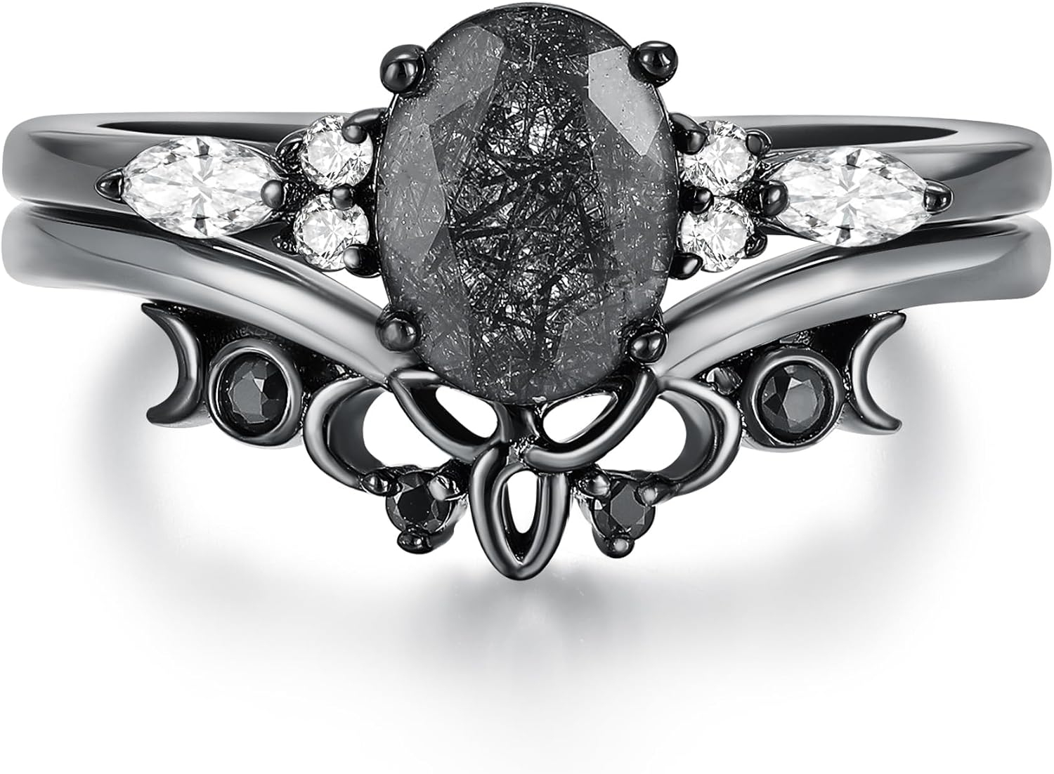 Oval Natural Black Rutilated Quartz Celtic Knot Bridal Wedding Ring Sets with Black Gold or Platinum Plated 925 Sterling Silver, Irish Gothic Engagement Rings and Spinel Trinity Annversary Band Size 4-9