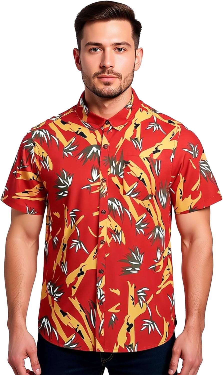 Mens Hawaiian Shirt Short Sleeve, Tropical Button-Down, Lightweight Summer Beachwear