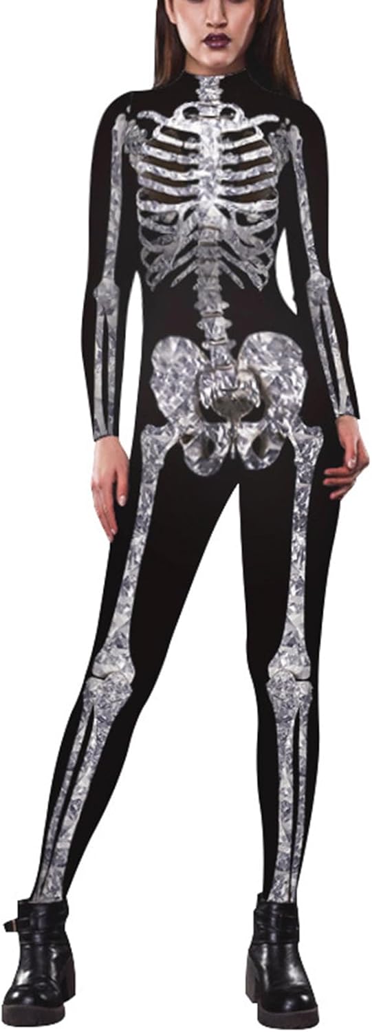 Womens Halloween Costumes Skeleton Costume Jumpsuit Long Sleeve Skinny 3D Print Skull Bodysuit Cosplay Outfit