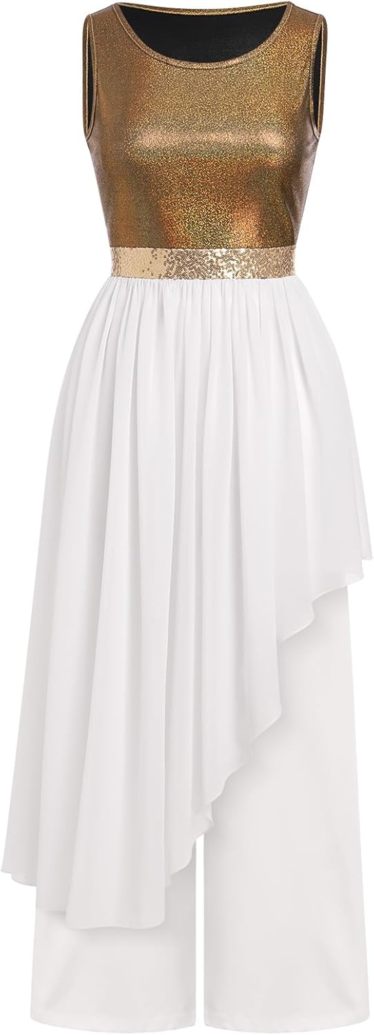 AFAVOM Praise Dance Dresses for Women Metallic Asymmetric Overlay Dress + Pants Worship Liturgical Dancewear Lyrical Costume