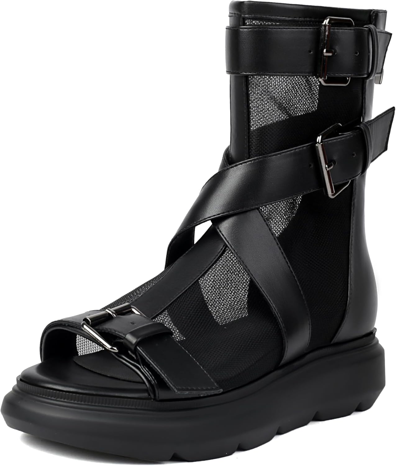 Black Leather Mesh Open Toe Flat Platform Sandals With Buckle Strap Casual Travel Back Zipper Mesh Cool Ankle Boots