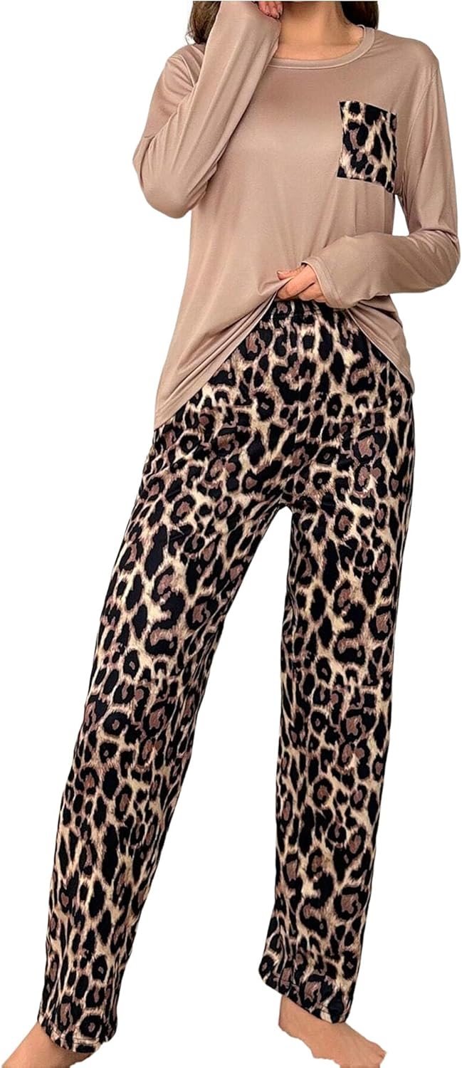 ZAFUL Women's Leopard Print Pajama Set Long Sleeve T-Shirt And Pants Pjs Sleepwear 2 Piece Lounge Set