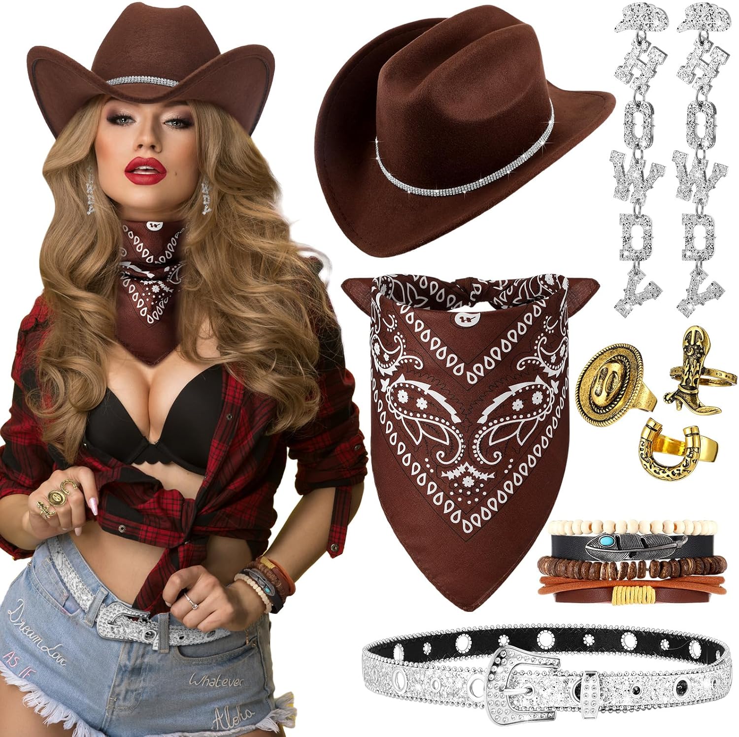 8 Pcs Rhinestone Cowboy Hat for Women with Glitter Belt Bandana Earrings for Western Country Concert Party
