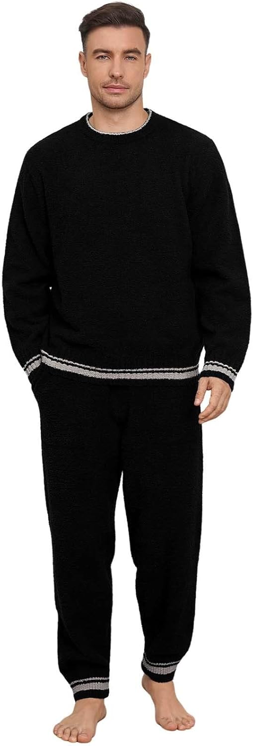 Mens Winter Pajamas Set Soft Warm Round Collar Long Sleeve Sleepwear Comfy Loungewear Pjs with Pockets