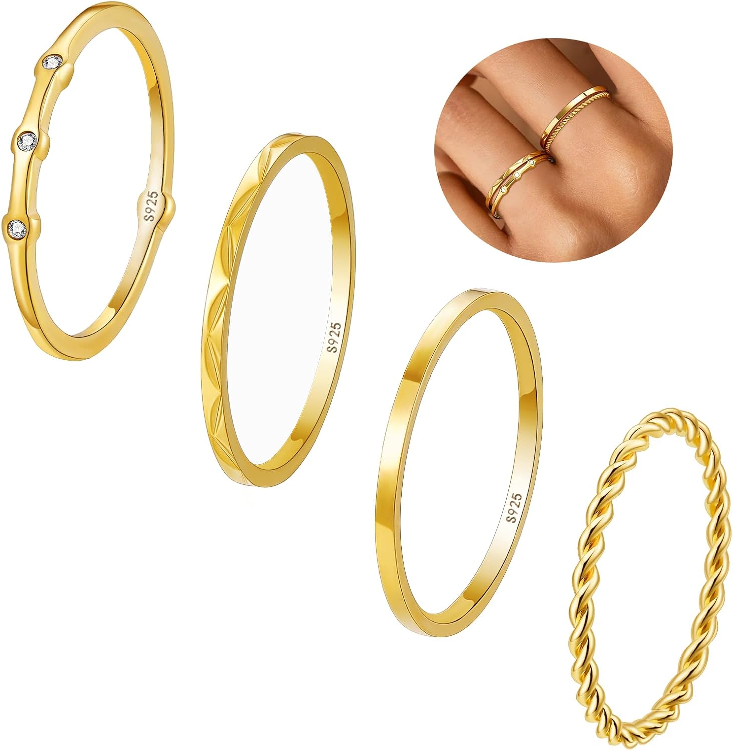 WEDDINEN S925 Sterling Silver Gold Rings for Women Non Tarnish, 4PC Stackable 18K Gold Plated Thin Thumb Ring Set Cubic Zirconia Dainty Stack Gold Knuckle Rings Set Size 6-10