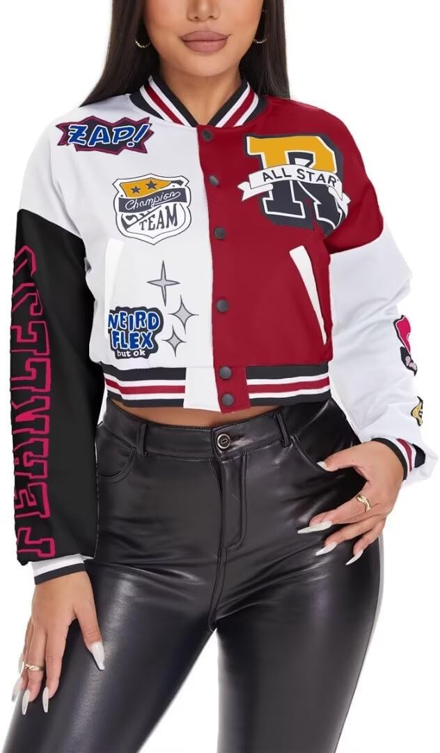 jeecoin Women's Varsity Jacket Cropped Colorblock Letter Print Baseball Bomber Jackets Vintage Streetwear Fashion Coats