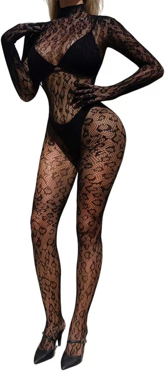 Women's Full Body Fishnet Costume - Long Sleeve Mesh Performance Bodysuit for Stage, Halloween & Theme Parties, Black