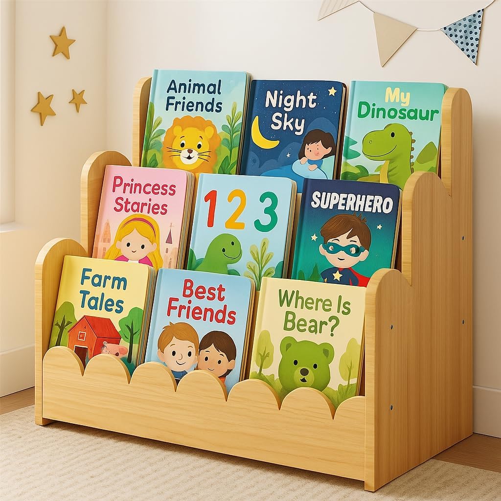 - SOLID WOOD QUALITY & SAFE DESIGN – Built from durable solid wood with a smooth natural finish, this toddler bookshelf ensures long-lasting use. Rounded scalloped edges add safety and charm, making it perfect for nurseries or playrooms.
