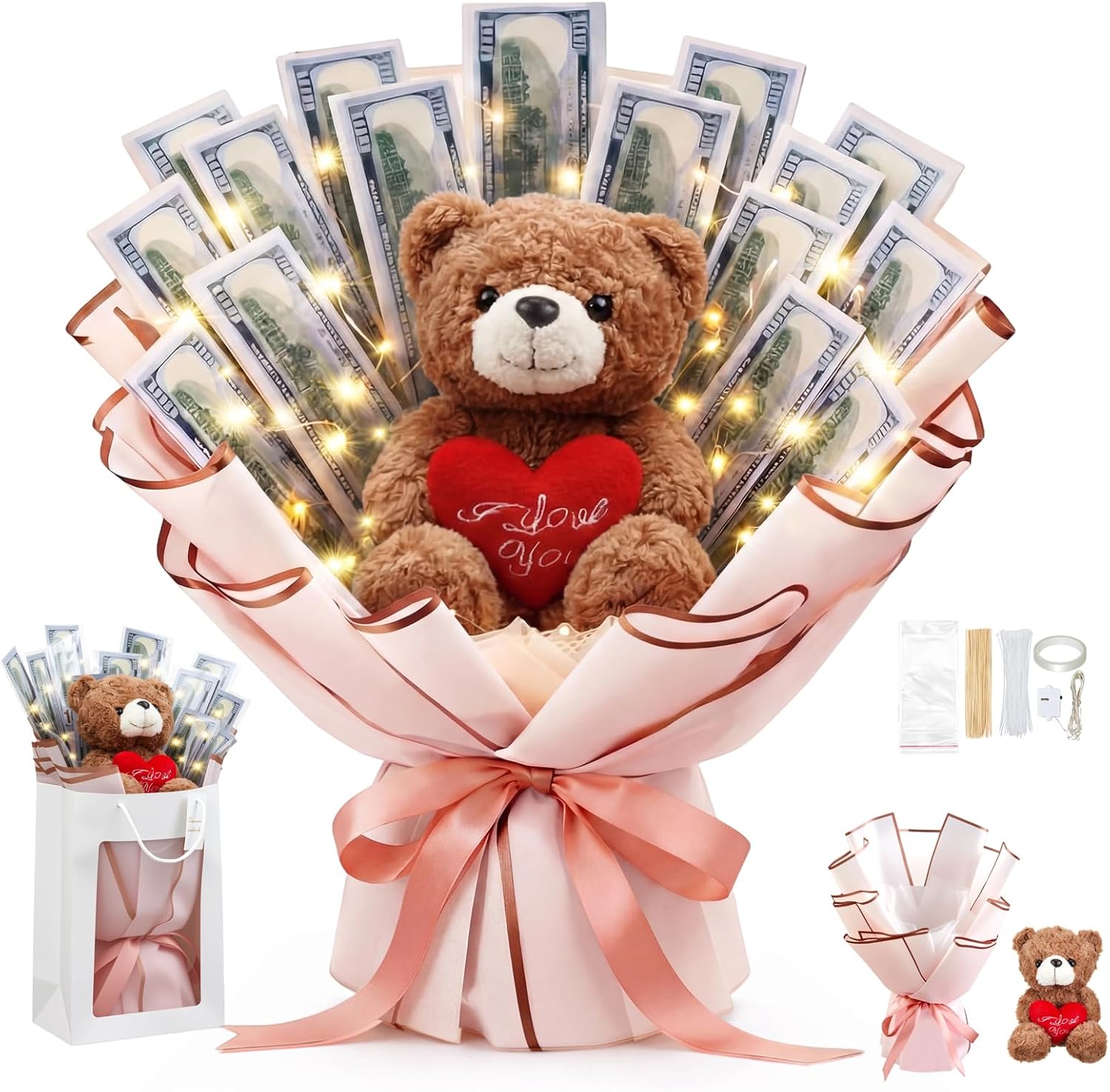 - Valentine's Mother's Day Money Flower Bouquet: you will get 1 cute bear holding a love heart, 1 semi-finished bouquet packaging box, 50 self-adhesive bags for cash, 1 string of decorative lights, 50 bamboo sticks, 20 zip ties, 1 roll of transparent tape, 1 white gift bag, and 1 instruction manual; Note: requires self-assembly; Fresh flowers are not included