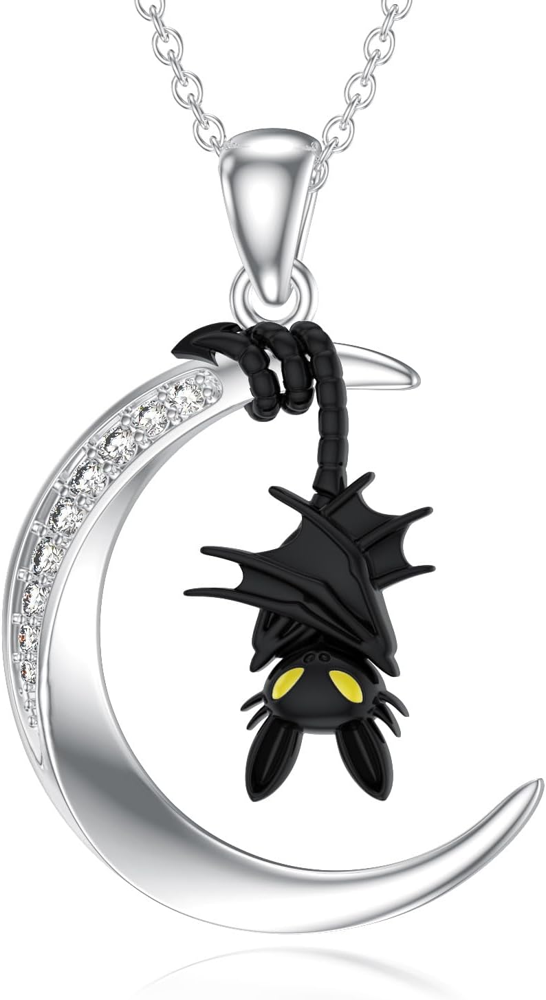 Diamond Bat Necklace Sterling Silver Halloween Moon Bat Pendant Necklaces with Lab Grown Diamonds Halloween Jewelry Gift for Mom Wife