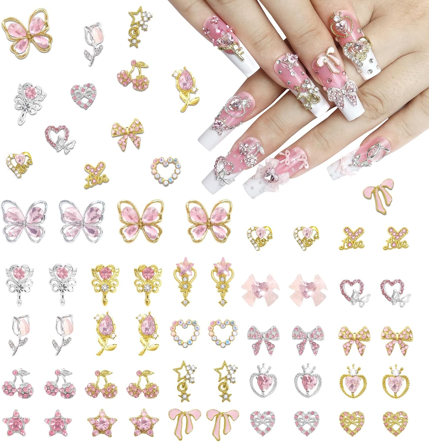 - Package Content:You will get 50pcs Y2K nail charms in 24 styles, 2-4 per style, including hearts, butterflies, star lights, tulips, bows, cherries, magic wands, etc. These exquisite nail art charms are all equipped with sparkling gemstones that can make your nails charming. Different shapes and colors of nail accessories will support you to achieve many wonderful DIY decoration ideas.
