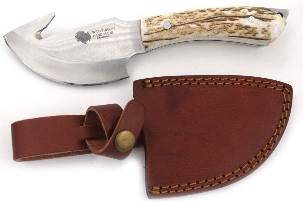 Wild Turkey Handmade Collection Full Tang Fixed Blade Gut Hook Skinner Knife w/Leather Sheath. (Stag)