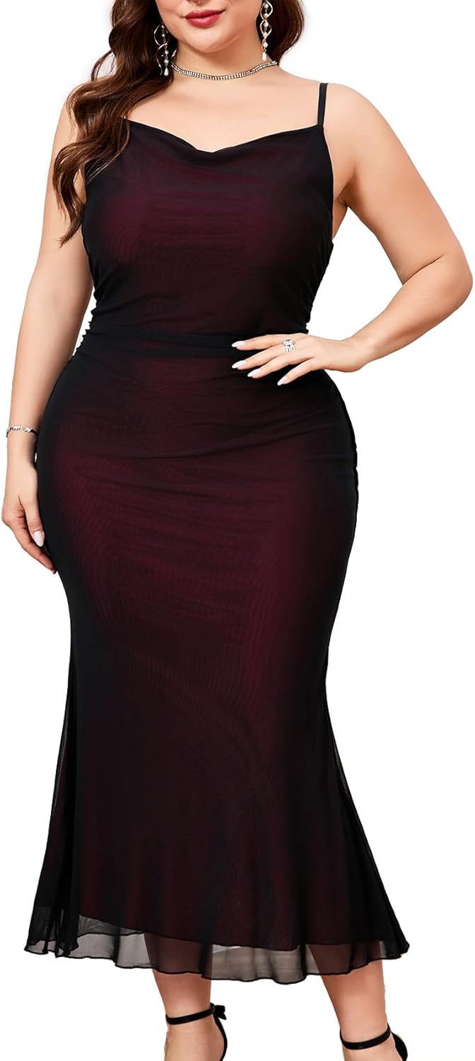 CYCLAMEN Plus Size Mesh Mermaid Dress Ruched Spaghetti Strap Fitted Sleeveless Cami Dresses Cocktail Party Wedding Guest, Black Burgundy, 1X