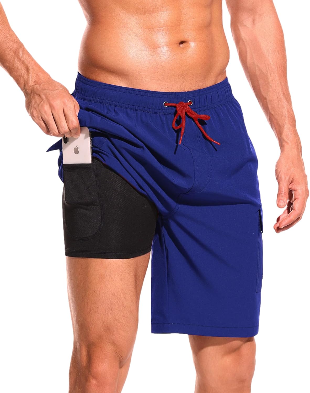 SILKWORLD Men's Swim Trunks with Compression Liner Quick Dry Bathing Suits 9 Inch Swimming Shorts with Cargo Pockets