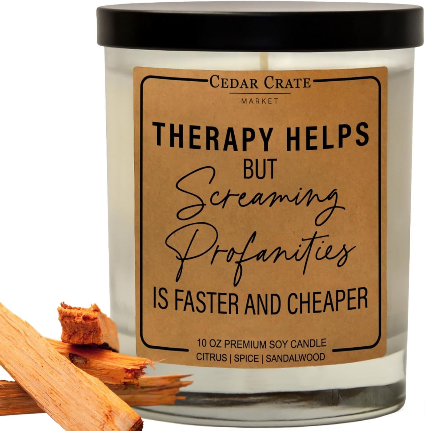 - FUNNY GIFTS: "Therapy Helps But Screaming Profanities is Cheaper and Faster", Kraft Label, 10-ounce Glass Jar, Scented Soy Candle, carefully packaged in a gift box, it is an excellent present for your best friend, coworker, sister, work friend, forever friend, Graduation Gift. Best Friend Birthday Gift, Best Friend Christmas Gift, Stocking Stuffers for friends, Best Friend Going Away Gift, Graduation, Congrats, retirement, long distance friendship, bday, mothers day, or any occasion.
