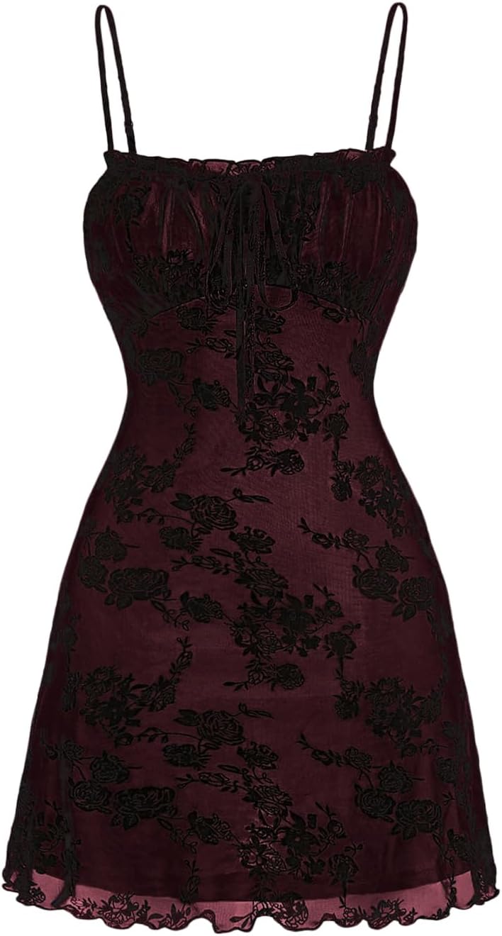 WDIRARA Women's Floral Print Mini Dress Y2K Vintage 90s Goth Mesh Short Cami Dresses