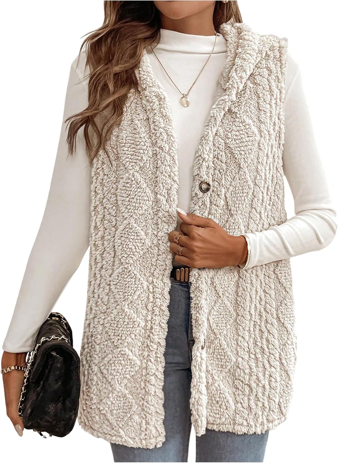 WDIRARA Women's Fuzzy Hooded Vest Outerwear Button Down Sleeveless Furry Coat