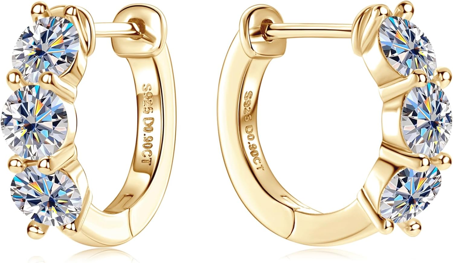 Moissanite Hoop Earrings, 1.2cttw D Color VVS1 Clarity 925 Sterling Silver 3 Stone Huggies Earring for Women and Men Birthday Wedding Jewelry Gifts (Gold)