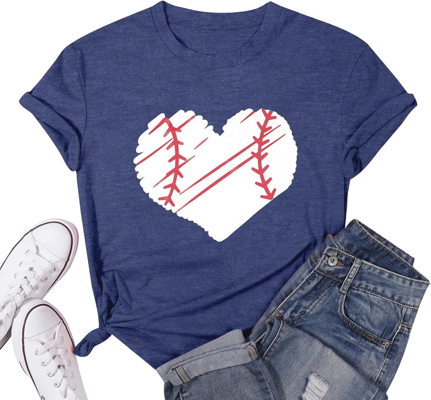 Baseball Shirt Women Baseball Heart Tee Shirts Baseball Mom Tshirt Game Day Casual Crew Neck Short Sleeve Tops