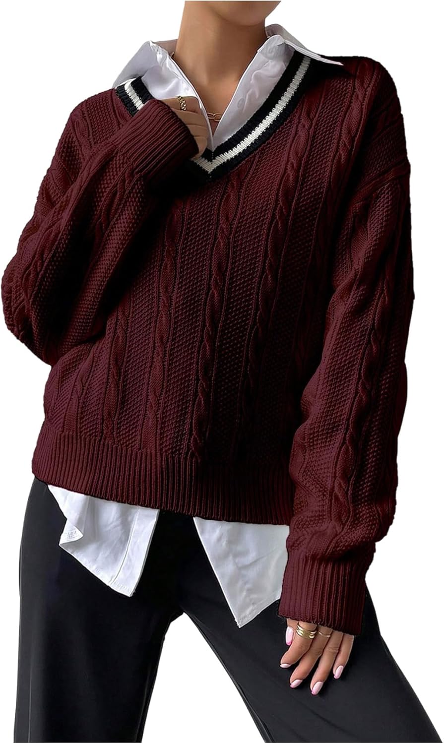 GORGLITTER Women's Striped Checkered Sweater Long Sleeve V Neck Oversized Knit Pullovers Tops