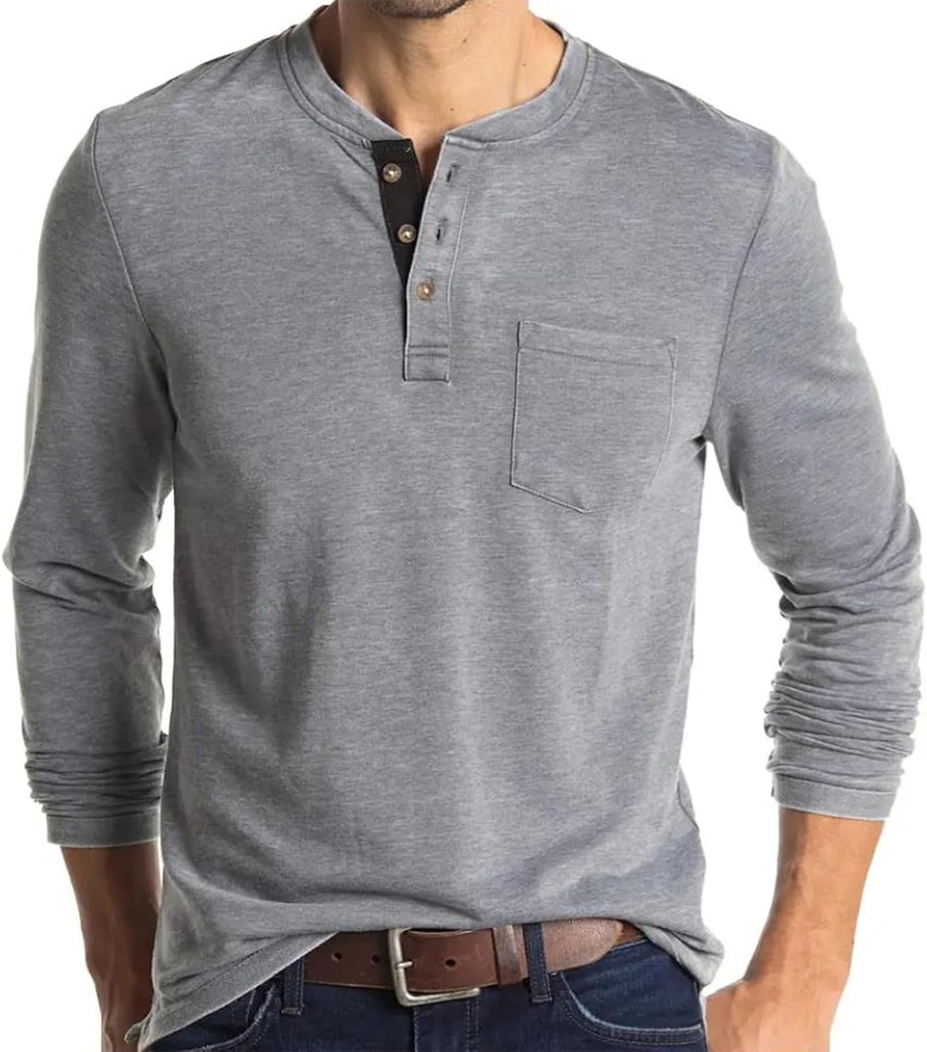 Men Henley Shirt Long Sleeve Lightweight Casual T-Shirts Tops Tees 3 Button Cotton Classic Blend with Pocket Grey
