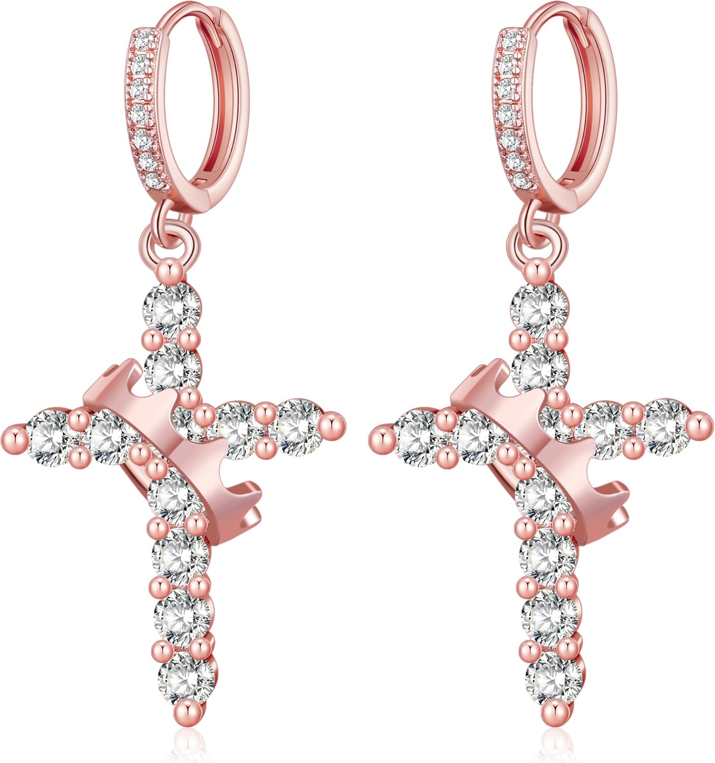 Hersin Crown Cross Earrings for Women 18K Gold Plated Diamond Drop Dangle Cross Hoop Earrings Small CZ Huggie Hoops Faith Cross Jewelry Gifts for Women Men