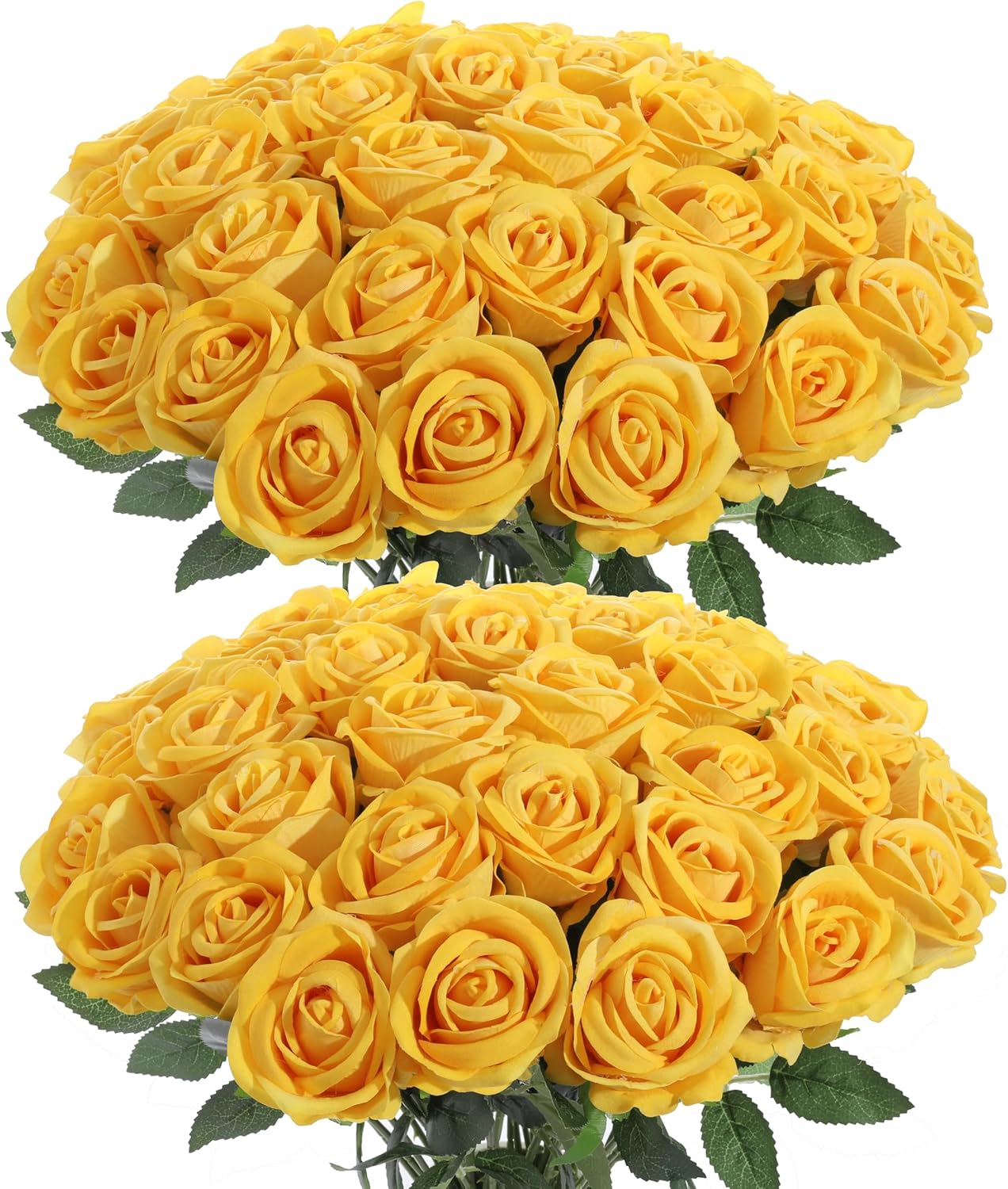 50Pcs Yellow Roses Artificial Flowers Fake Roses Faux Velvet Silk Flower for Home Wedding Decoration (Pearl Rose, Yellow)