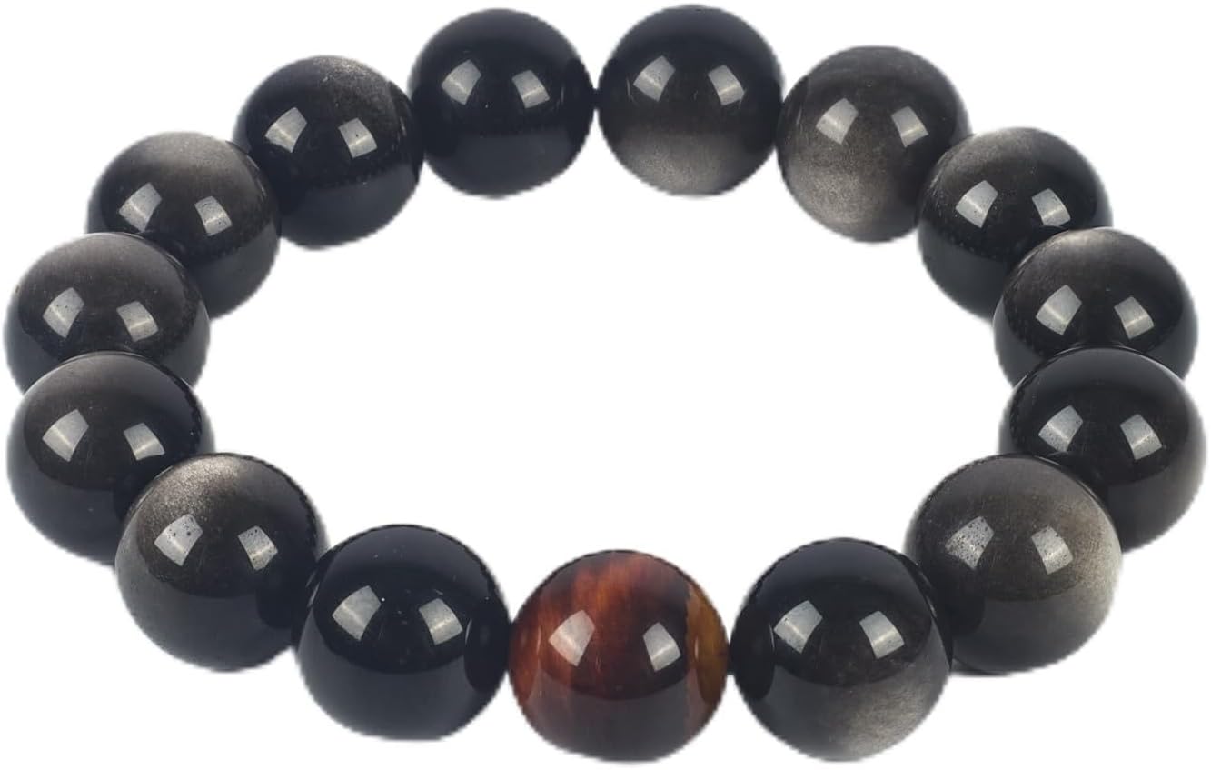 Natural Obsidian Bracelet For Men 10MM | Adjustable Stone Beaded Bracelet | Handmade Obsidian Stretch Elastic Bracelet for Men Women Gifts | with a Tiger Eye Stone | Black and Silver 7.5"