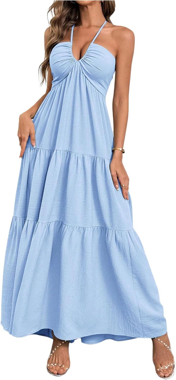 Floerns Women's Vacation Holiday Halter Long Dress Bowknot Back Ruffle Flowy Maxi Dresses