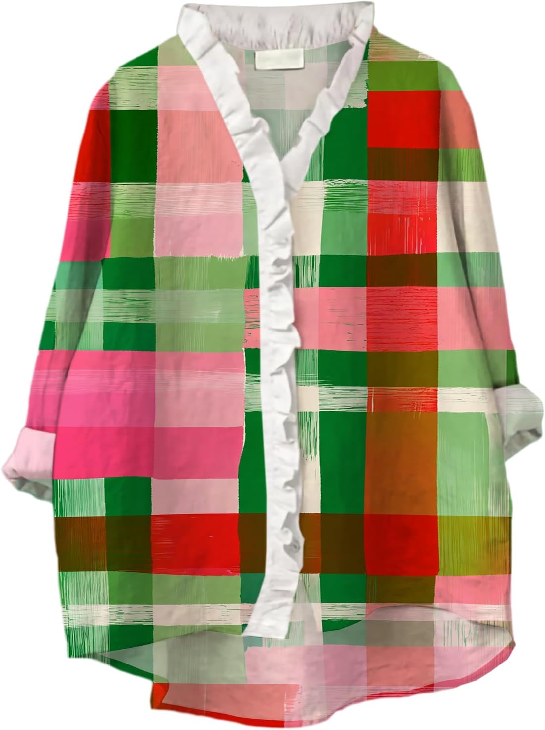 Womens Tops Button Down Ruffled V Neck Tunic Shirts Lightweight 3/4 Rolled Sleeves Flowy Boho Floral Print Blouses