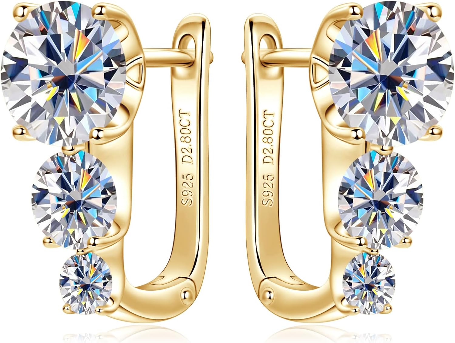 3-Stone Moissanite Hoop Earrings for Women, 5.6cttw D Color VVS1 Clarity 925 Sterling Silver U-Shaped Earrings for Wife Mom Birthday Holiday Jewelry Gifts