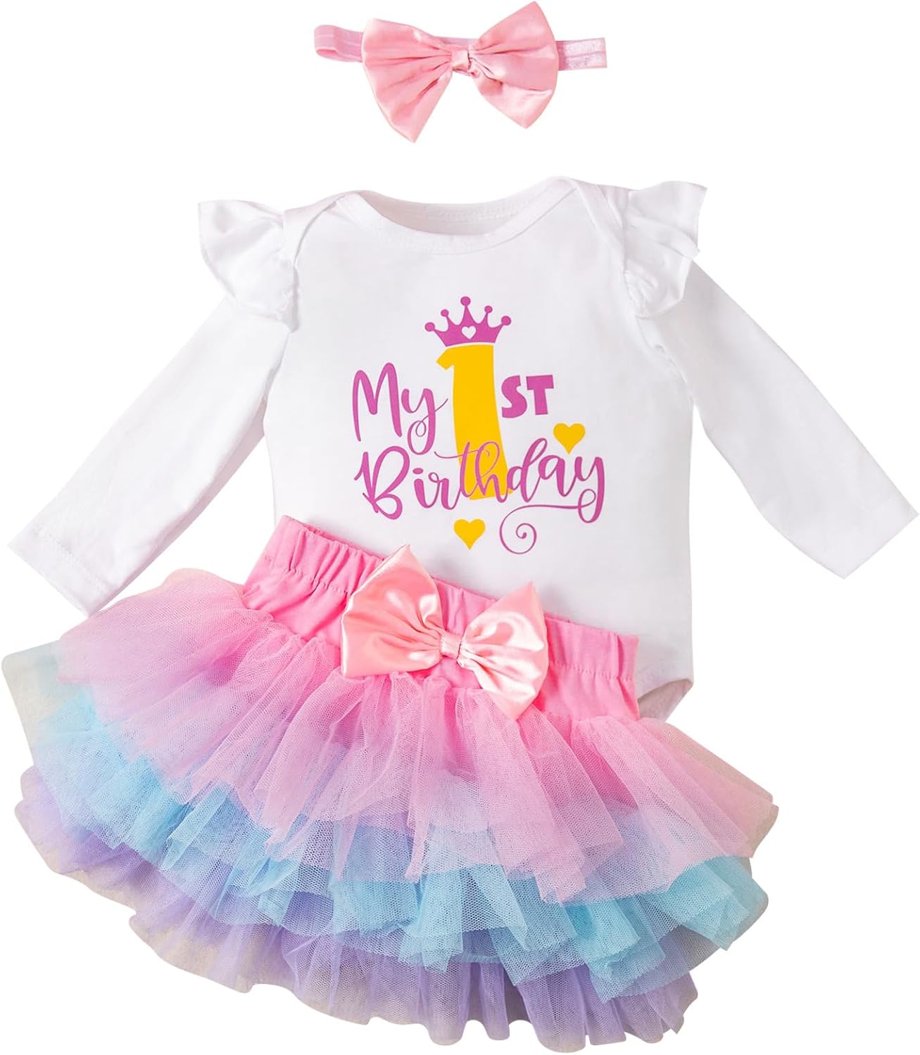 Winmany Baby Girl 1st Birthday TuTu Skirt Set Long Sleeve Romper First Birthday Smash Cake Outfits Party Dress Set