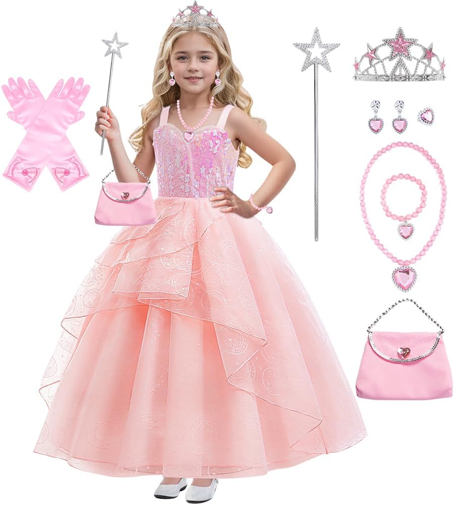 Kids Pink Witch Costume for Girls Pink Bubble Tulle Dress Princess Sequins Mesh Outfits with Accessory set