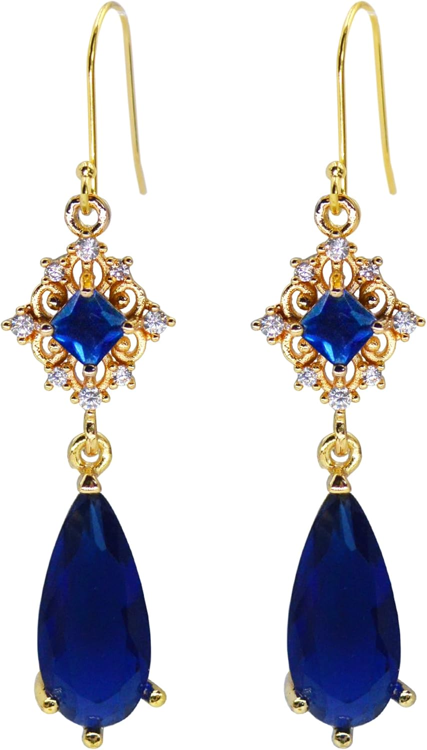 MOMOCAT 18K Gold Plated Royal Blue Imitation Sapphire Earrings for Women Vintage Glass Dangle Teardrop Earrings Jewelry for Women Bridal Wedding Earrings