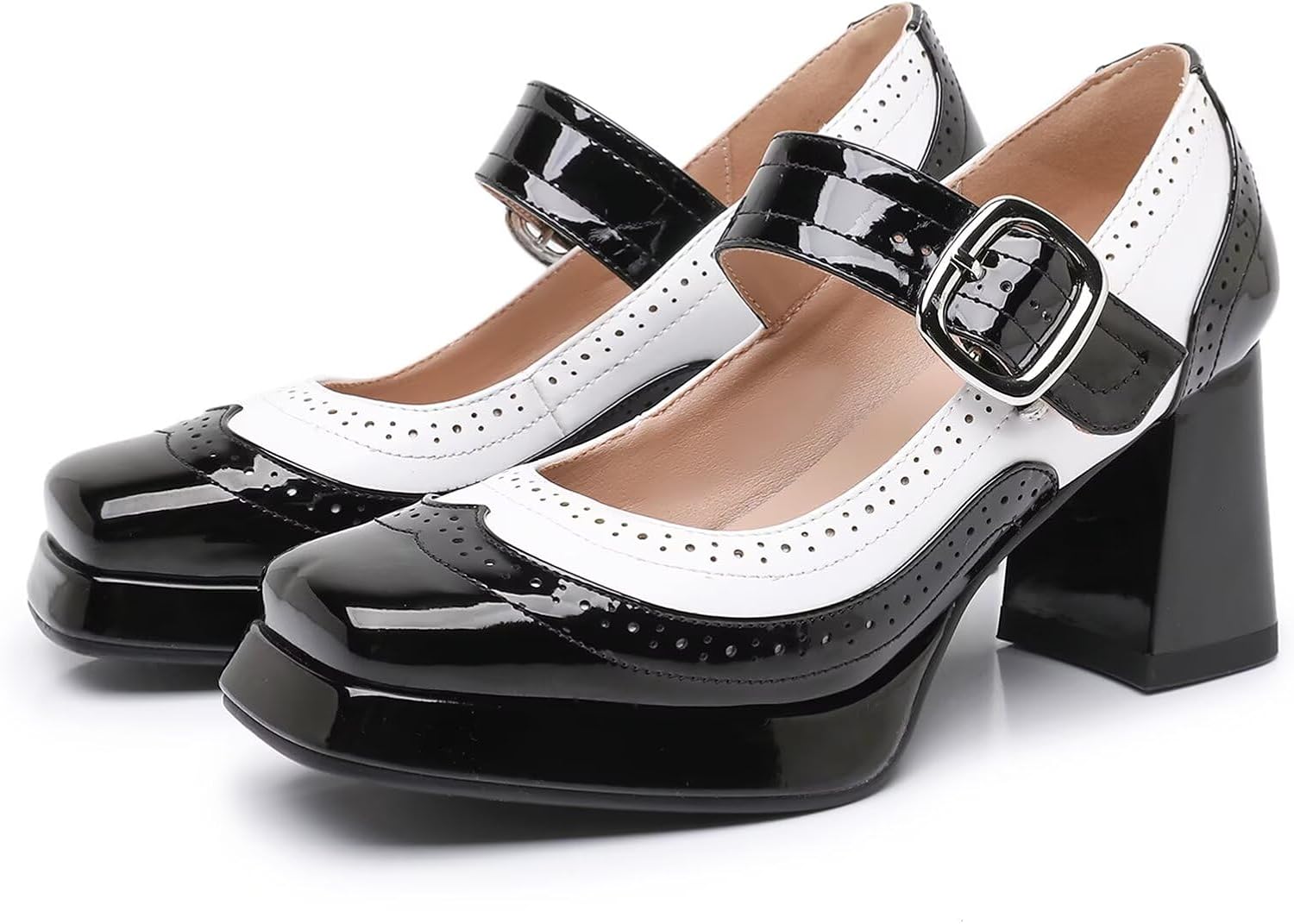 Platform Mary Jane Heels for Women Chunky Low Block Heels Patent Mary Jane Round Toe Pumps with Buckle Strap Retro Fashion Closed Toe Dress Shoes